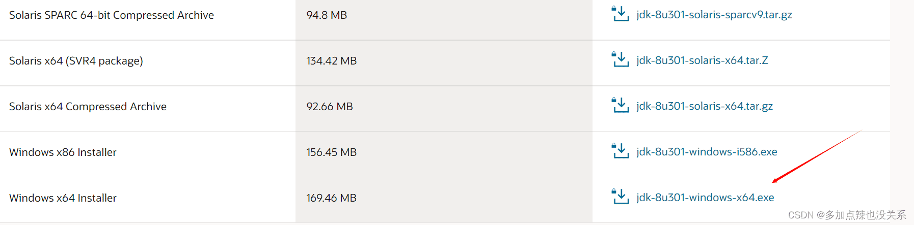 点击你想要下载的 jdk 版本,比如:我选择了 jdk 8,然后我要下载到 windows 操作系统下,那我就选择这个,点击下载就可以了