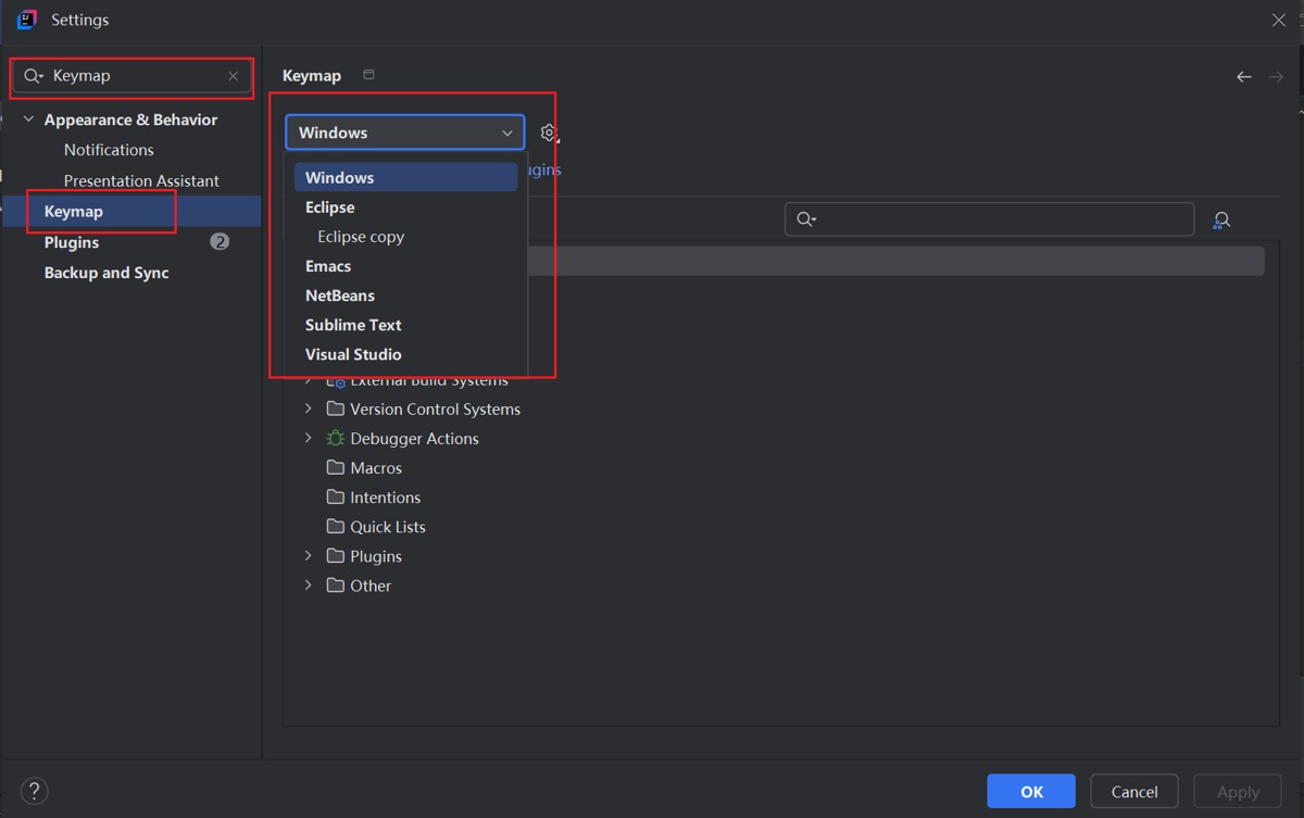 在设置页面左侧导航中选择 “Keymap”。 在右侧的 “Keymaps” 下拉列表中,选择你想要的快捷键风格,如 “Eclipse” 等。 如果想要使用该快捷键风格,则点击右侧的 “Copy” 按钮复制一份,你可以设定成自己想要的名字,然后点击 “Apply” 和 “OK” 即可使用。