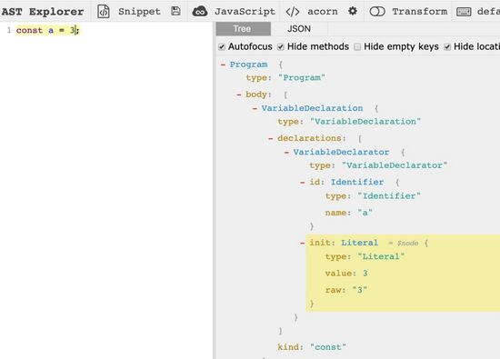 我们在日常工作中经常会不经意间与它打交道,如 eslint 与 babel ,都会涉及到 js 与代码中游走。不同的解析器会生成不同的 AST,司空见惯的是 babel 使用的解析器 babylon ,而 uglify 在代码压缩中使用到的解析器是 UglifyJS 。 你可以在 AST Explorer [3] 中直观感受到,如下图: