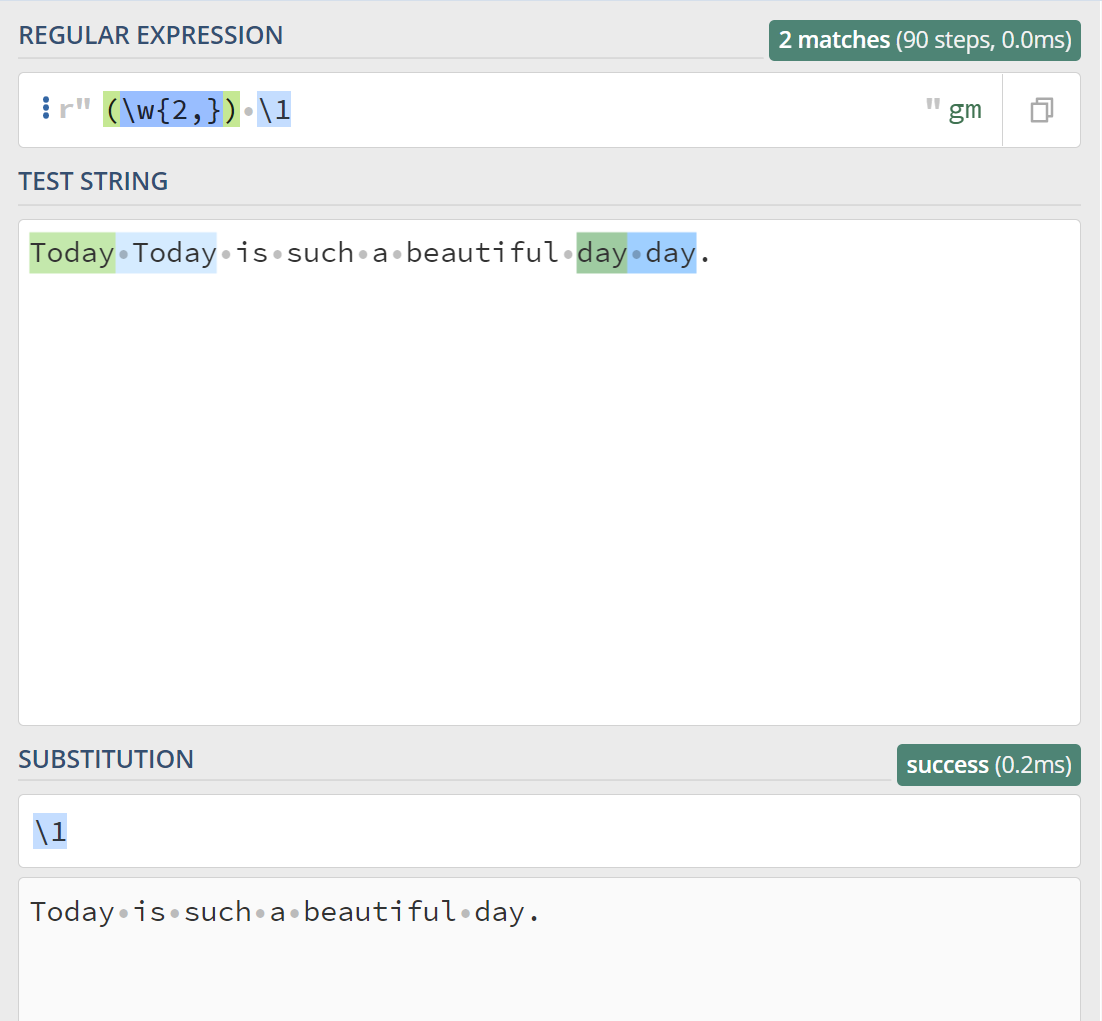 4.查找与替换 到这里我们已经学完了分组与引用的知识,一起来实践下,有这样一个需求,在一个目标字符串中,查找两个重复出现的单词。 还没有学到单词边界,我们先用 \w{2,} 来表示出现的单词,重复的单词就是 (\w{2,} \1),看下结果: