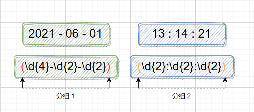 可以看到在表达式中出现了几对括号,为什么要用括号把表达式括起来,这些括号有什么作用呢,我们一起来看下。 1.分组与编号 括号在正则中可以用于分组,被括号括起来的部分可以称为子表达式,会被保存成一个子组。 举个栗子,有一个日期时间 2021-06-01 13:14:21,我们想要提取出其中的日期和时间,就要用括号对日期和时间进行分组,如下图所示: