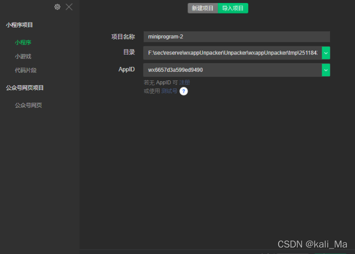 不出意外应该没啥问题,但意外往往很多。node版本问题,依赖问题等等都有可能导致解包失败,这个时候就希望懂nodejs的同学深入了解小程序的打包压缩逻辑,然后动手二开项目。不懂的又没打算往这方面深入研究的怎么办呢,那换一个目标呗。 调试打开微信开发者工具,选择导入项目