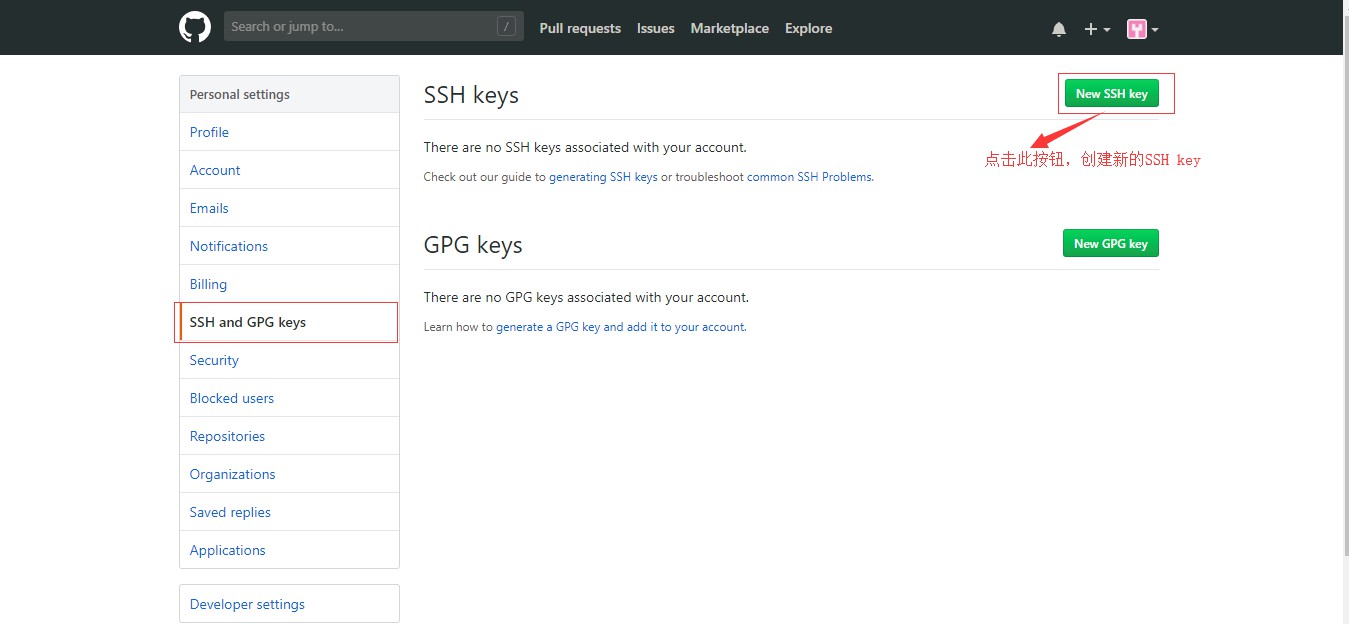然后打开SSH keys菜单, 点击Add SSH key新增密钥,如下图所示: