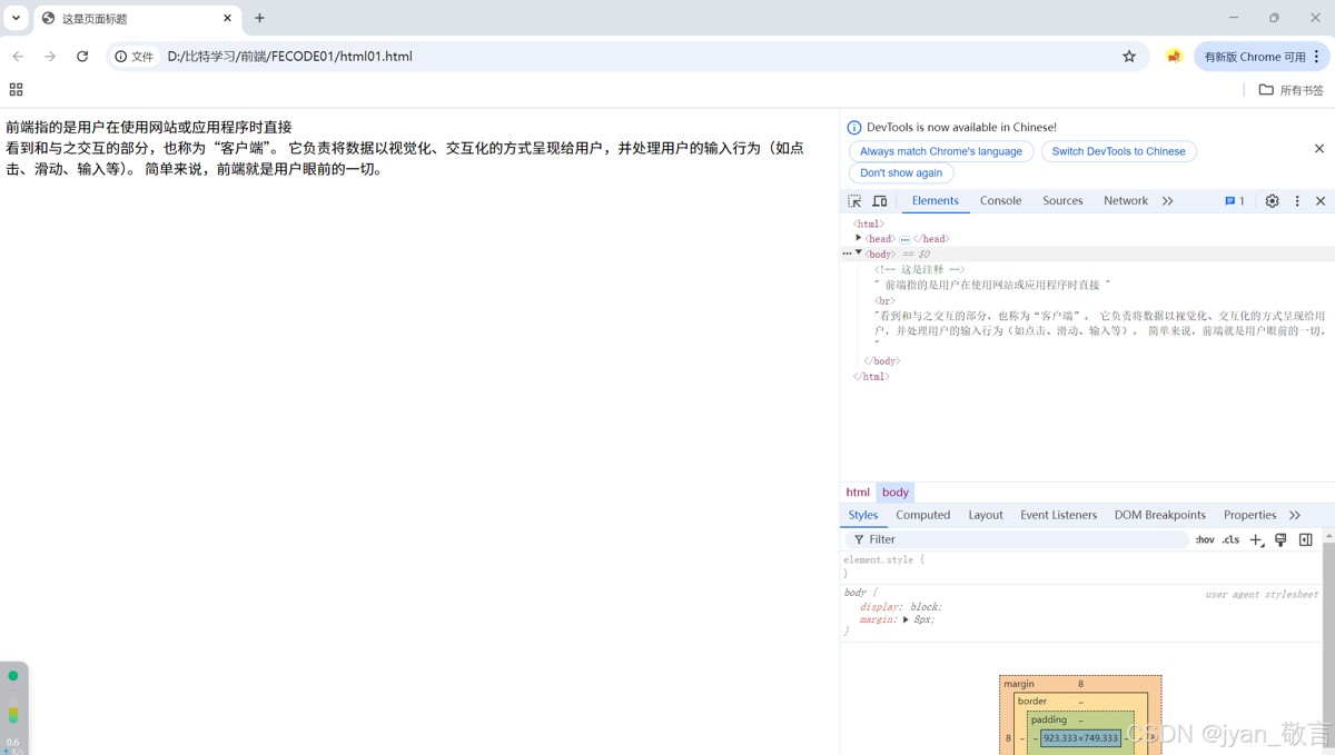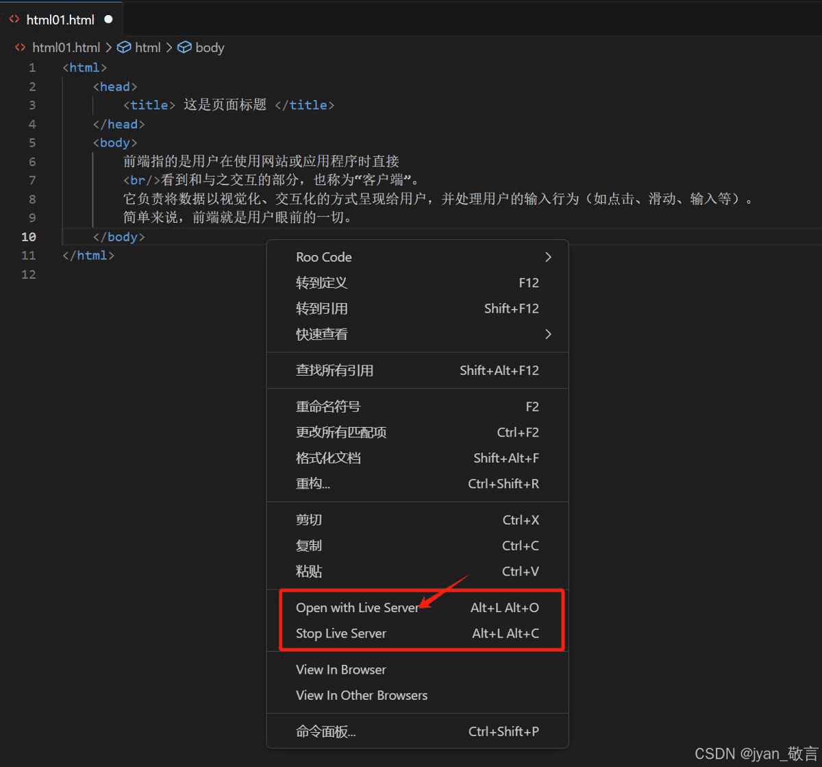 点击“Open whirh Live Server”选项后,会直接在浏览器上显示更新内容。 四、基本操作这里就先介绍一种,显示页面代码。 快捷键:fn+f12
