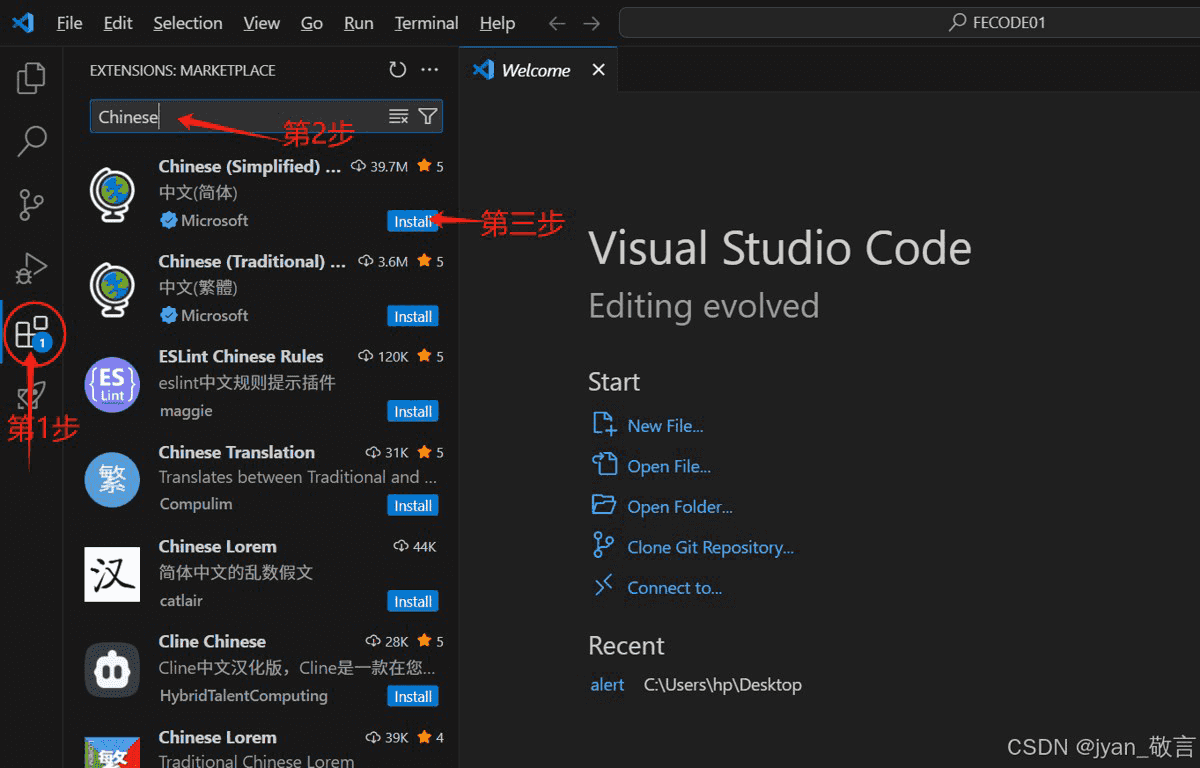 找到左侧栏中的插件,点击进入搜索框,输入“Chinese”,点击install进行安装。