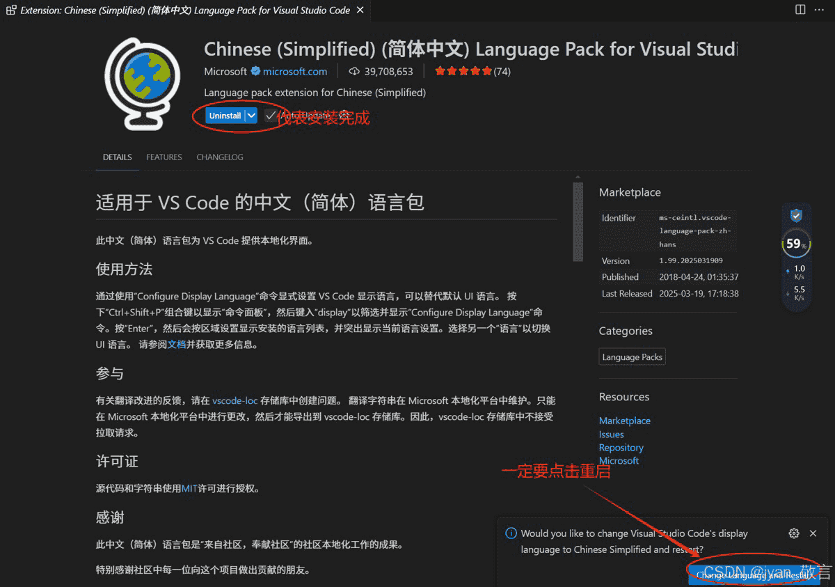 安装完成后,会出现重启选项,Chinese插件要重启后才能实行。