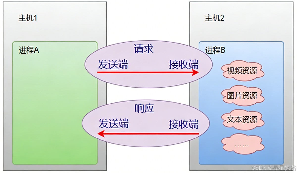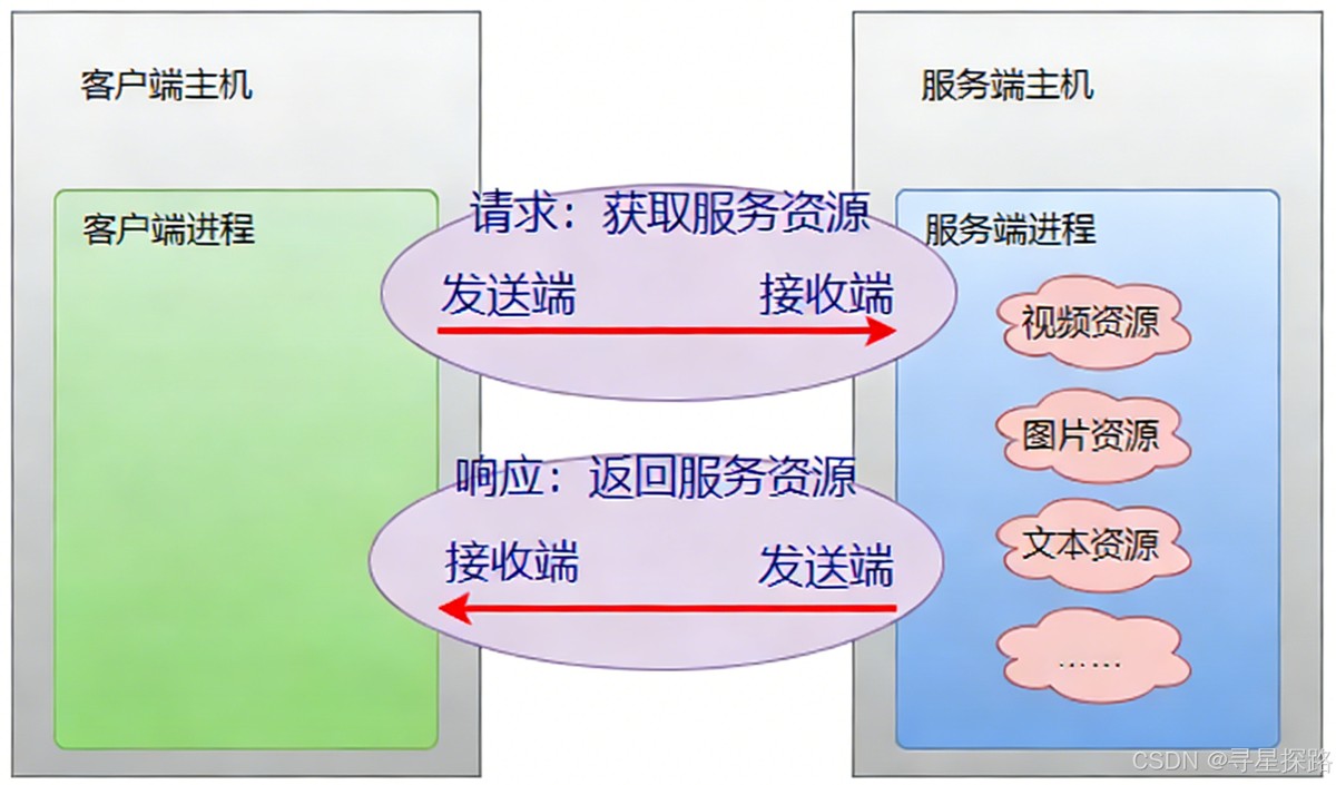2. 客户端 (Client) 与 服务端 (Server):服务端在网络中“常驻”,被动等待连接,提供特定服务(如视频资源、图片资源);客户端则是主动发起请求的一端。