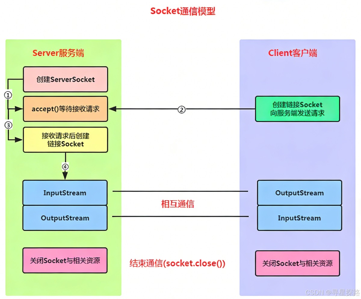 - accept():该方法会产生阻塞。一旦客户端尝试建立连接,它会返回一个全新的 Socket 对象,用于和服务端进行后续的点对点通信。