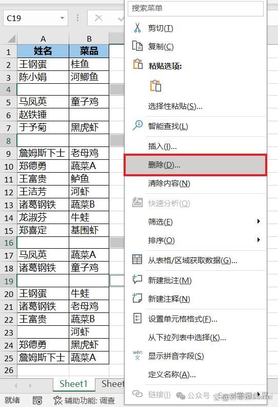 5. 将光标放到选中的任意单元格处 --> 右键单击 --> 在弹出的菜单中选择“删除”
