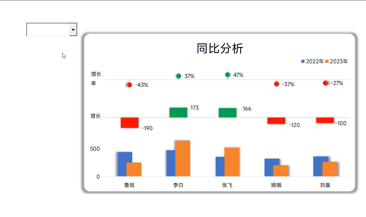 一、 在Excel做动态图 首先我们需要在Excel中先利用控件制作一个动态的图表,通过点击控件图表能发现动态变化,有2个关键的位置 A8:A9这个位置是我们下拉中的内容 C9这单元格是下拉的结果