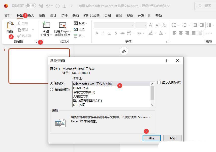 三、 复制到PPT在Excel表格中粘贴后,我们需要来到PPT中,在左上角点击【开始】找到粘贴,然后在粘贴中找到【选择性粘贴】我们需要在新的窗口中选择【Excel工作表对象】然后点击确定 选择Excel工作表对象,其实就是将整个Excel文件都粘贴到了PPT中,我们用鼠标双击粘贴的形状,就可以显示一个EXCEL的窗口。