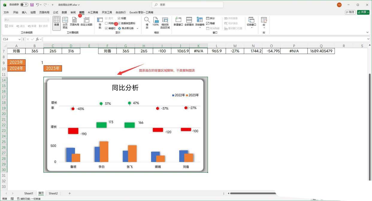 二、 准备工作1. 将图表中的控件删掉,等下会在PPT中重新构建 2. 点击视图找到【网格线】不勾选网格线,让图表更加简洁一些 3. 选择图表所在的单元格区域复制,一定不要直接复制图表,这一点非常重要 4. 下拉控件的内容A8:A9这个区域,以及下拉结果C9位置需要固定