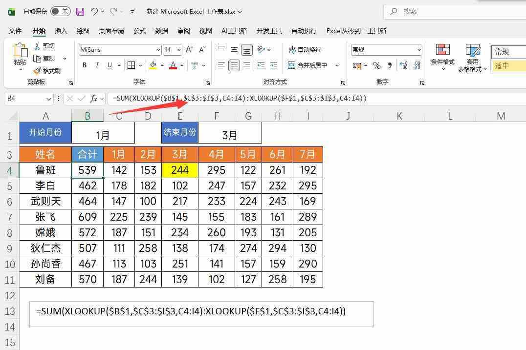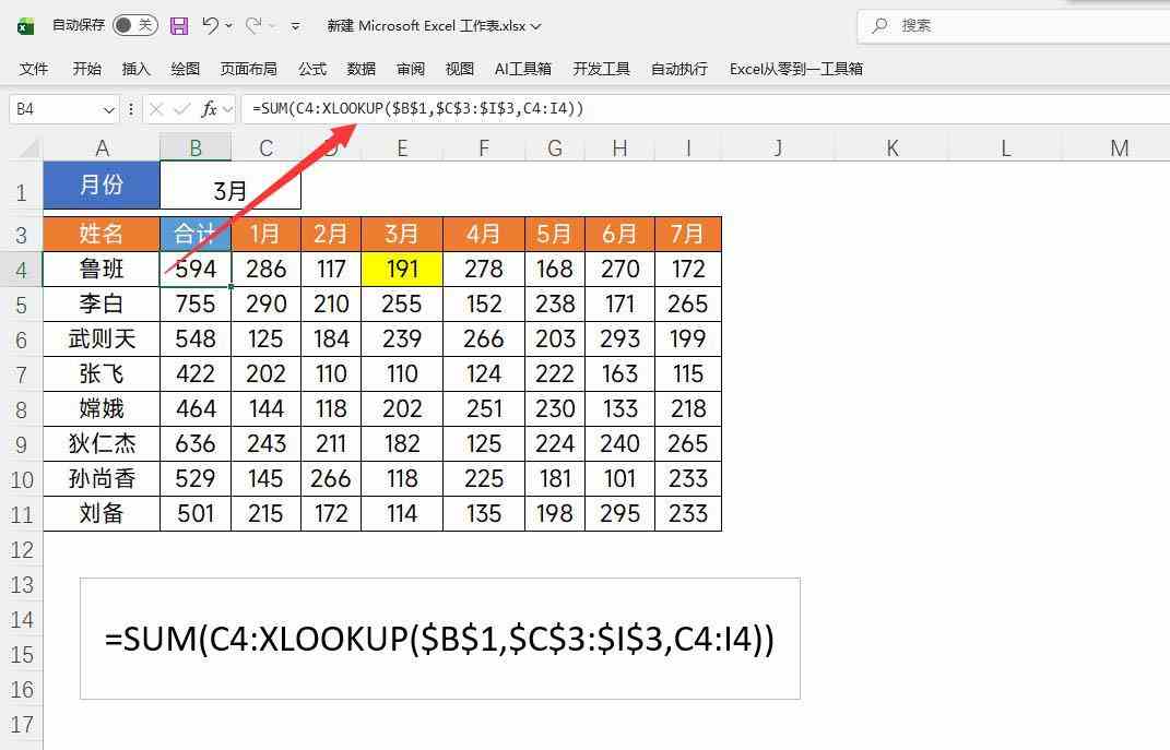 有粉丝可能会说,感觉也没什么用啊,那你就大错特错了,我们可以利用这个特性来实现很多的动态效果,下面来看几个例子 二、 累加求和公式:=SUM(C4:XLOOKUP($B$1,$C$3:$I$3,C4:I4)) 在这里C4是第一个数据的位置,也是计算的起始位置,获取了起始位置,我们在利用Xlookup查找到月份对用的位置,组成一个数据区域,这个区域就是我们的求和区域,最后利用SUM函数求和即可,效果类似于: =SUM(C4:E4)