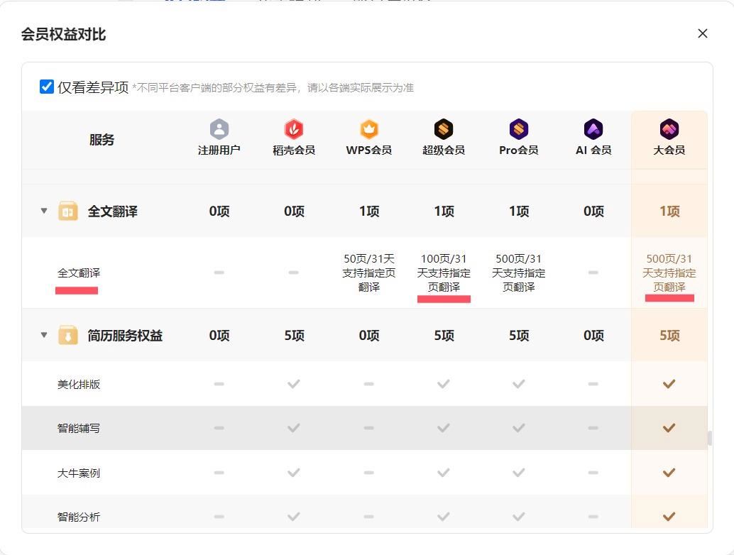 5. wps大会员每31天支持指定页翻译500页,wps超级会员每31天只支持指定页翻译100页。