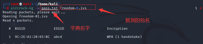 表明成功抓取到握手包,进行下一个步骤 开始破解包在**/home/kali/**文件夹下,找到名叫freedom-01.ivs文件,这个就是抓到的包