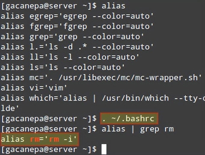alias命令将确认rm现在是别名: 但是,这只会在当前 shell 中的当前用户会话期间持续。要使更改永久生效,您必须将其保存到~/.bashrc(某些发行版可能会使用~/.profile), 如下所示: