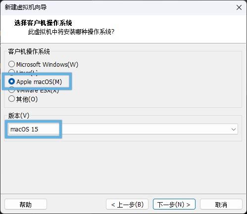 选择兼容 Workstation 17.5 及更高版本 2、选择「稍后安装操作系统」,然后在「客户机操作系统」选择「Apple macOS」,「版本」下拉菜单中选择「macOS 15」。
