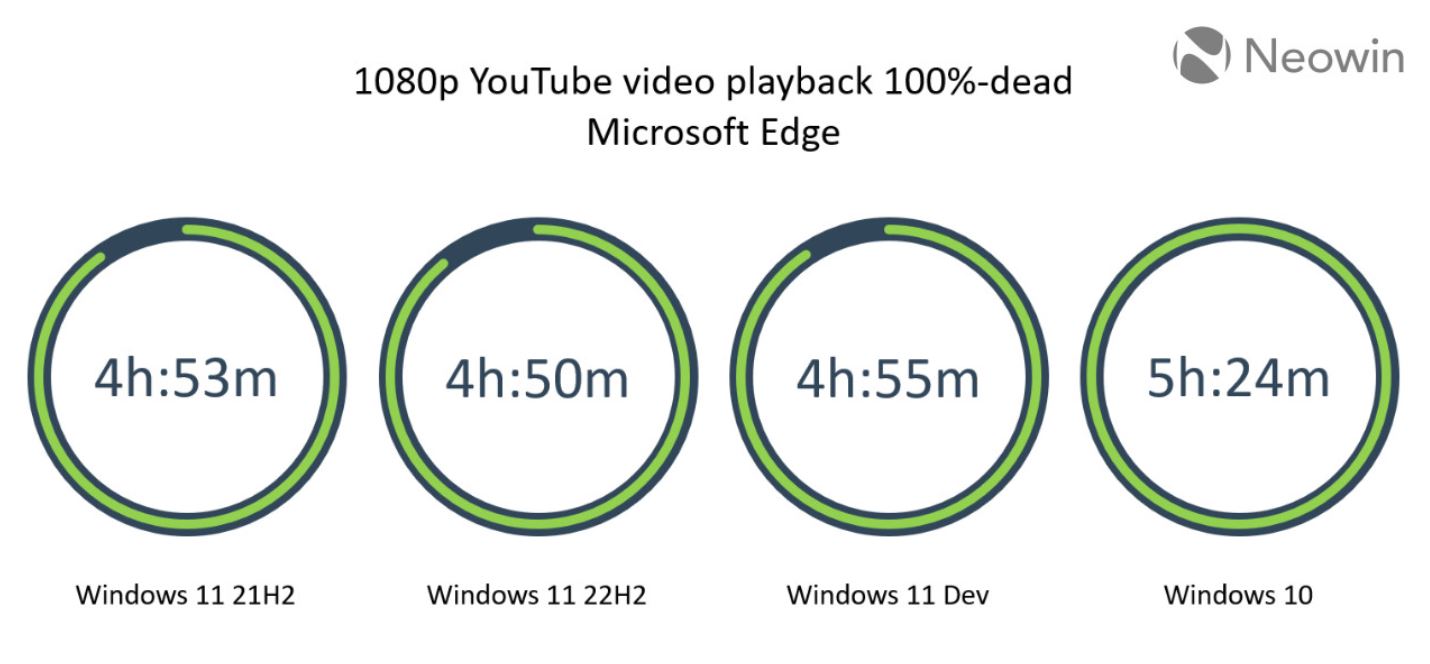 我们了解到,浏览器测试中,使用 Edge 浏览器播放 1080p YouTube 视频,显示 Windows 10 的续航比 Windows 11 长 30 分钟左右。