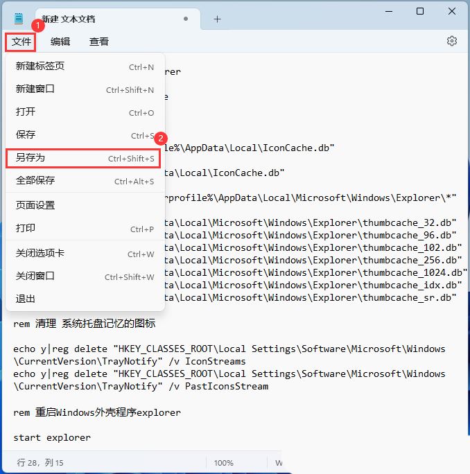 2、新建 文本文档窗口,输入以下命令: rem 关闭Windows外壳程序explorer taskkill /f /im explorer.exe rem 清理系统图标缓存数据库 attrib -h -s -r "%userprofile%\AppData\Local\IconCache.db" del /f "%userprofile%\AppData\Local\IconCache.db" attrib /s /d -h -s -r "%userprofile%\AppData\Local\Microsoft\Windows\Explorer\*" del /f "%userprofile%\AppData\Local\Microsoft\Windows\Explorer\thumbcache_32.db" del /f "%userprofile%\AppData\Local\Microsoft\Windows\Explorer\thumbcache_96.db" del /f "%userprofile%\AppData\Local\Microsoft\Windows\Explorer\thumbcache_102.db" del /f "%userprofile%\AppData\Local\Microsoft\Windows\Explorer\thumbcache_256.db" del /f "%userprofile%\AppData\Local\Microsoft\Windows\Explorer\thumbcache_1024.db" del /f "%userprofile%\AppData\Local\Microsoft\Windows\Explorer\thumbcache_idx.db" del /f "%userprofile%\AppData\Local\Microsoft\Windows\Explorer\thumbcache_sr.db" rem 清理 系统托盘记忆的图标 echo y|reg delete "HKEY_CLASSES_ROOT\Local Settings\Software\Microsoft\Windows\CurrentVersion\TrayNotify" /v IconStreams echo y|reg delete "HKEY_CLASSES_ROOT\Local Settings\Software\Microsoft\Windows\CurrentVersion\TrayNotify" /v PastIconsStream rem 重启Windows外壳程序explorer start explorer