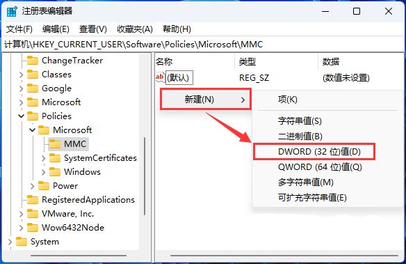 4、注册表编辑器窗口,依次展开到以下路径:计算机\HKEY_CURRENT_USER\Software\Policies\Microsoft\MMC PS:没有MMC这个项解决方法