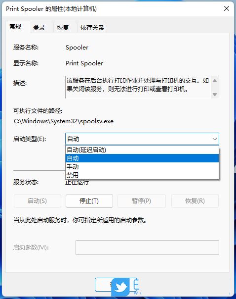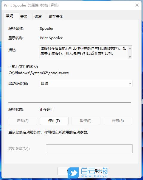 4、Print Spooler 的属性(本地计算机)窗口,先点击【停止】,再点击【启动】;