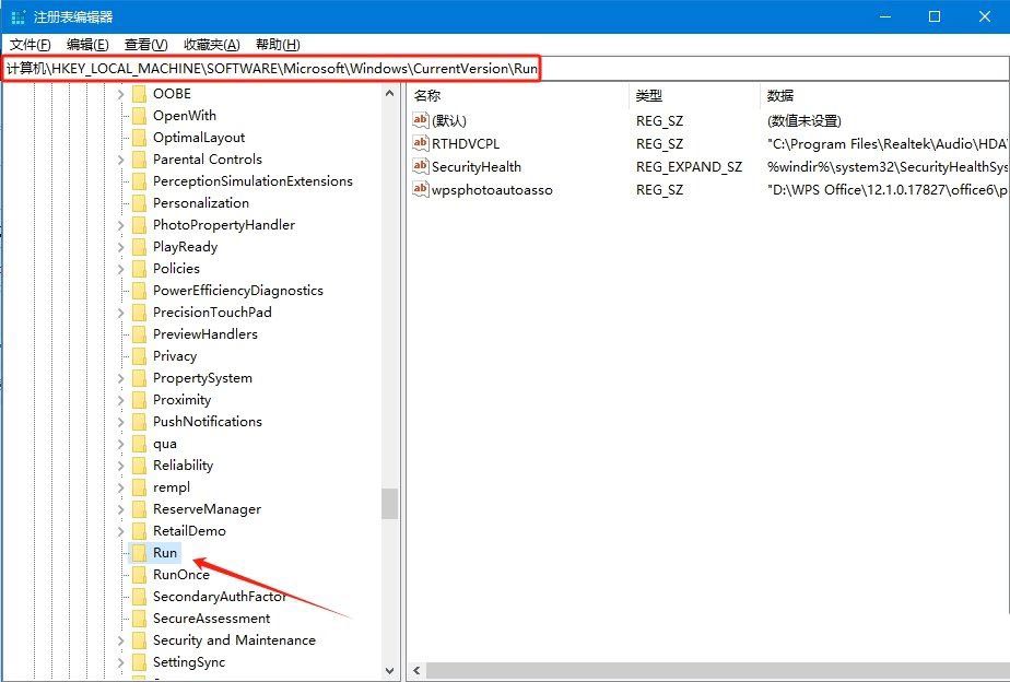 2、 接着,依次点击展开以下位置“HKEY_LOCAL_MACHINE\SOFTWARE\Microsoft\Windows\CurrentVersion\Run”。