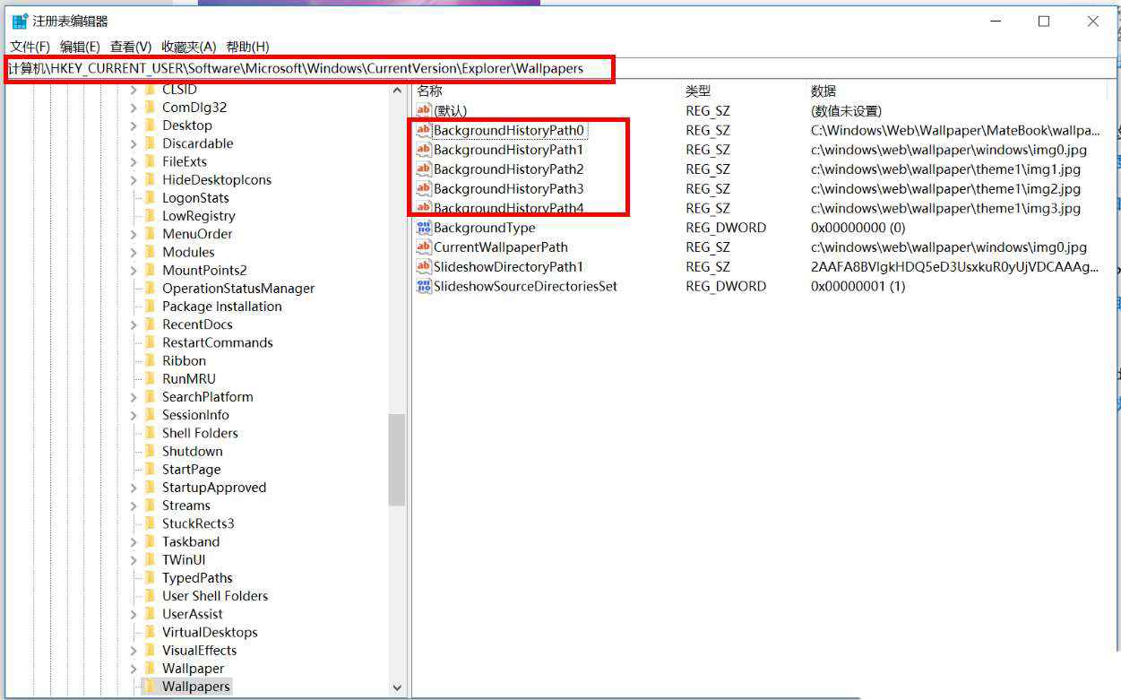4、注册表编辑器窗口,依次展开到以下路径:HKEY_CURRENT_USERSoftwareMicrosoftWindowsCurrentVersionExplorerWallpapers在右侧窗口中可以显示所有的历史桌面背景,按照 0 - 4 排列