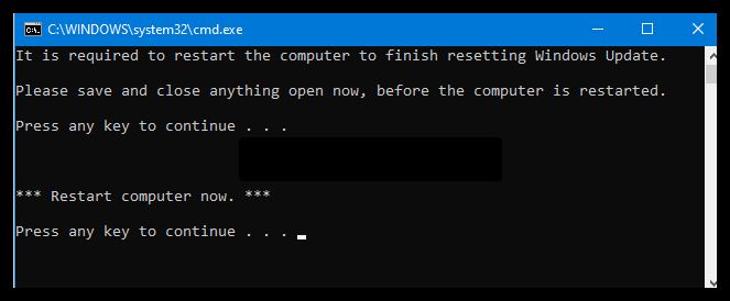 echo Cannot reset Windows Update since "Windows Update" (wuauserv) service failed to stop. Please restart the computer, and try again.