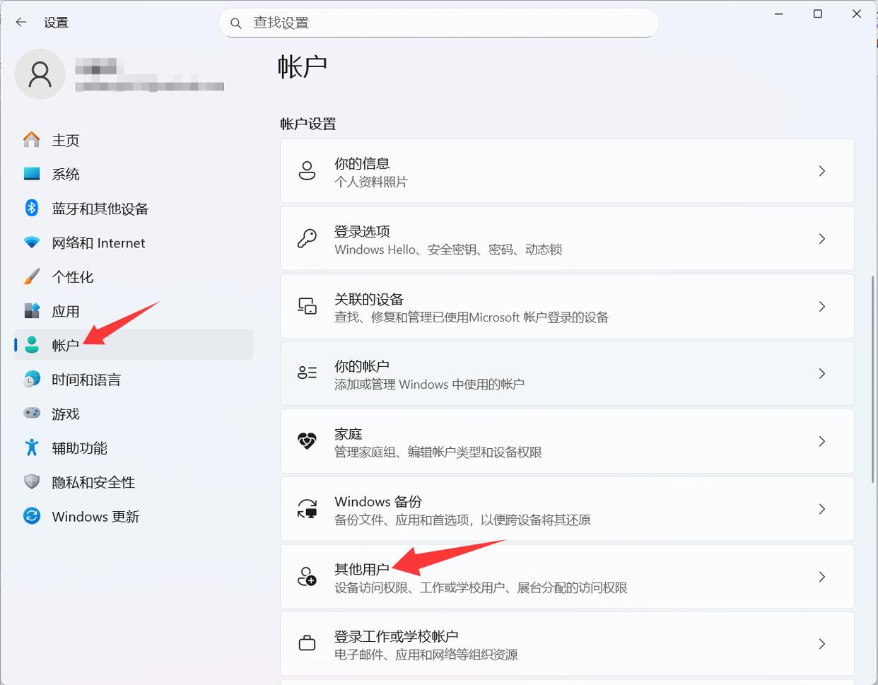 在【设置】窗口左侧列表中选择【帐户】,在右侧的【帐户设置】下面选择【其他用户】。