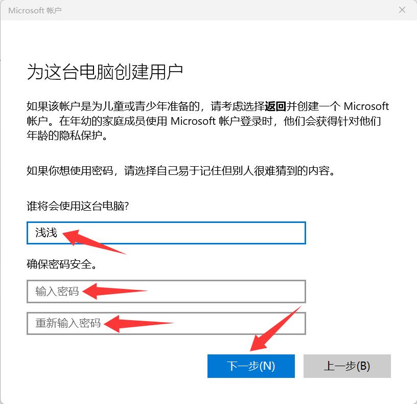 按需设置用户信息,输入密码并重新输入密码确认密码(可选),再点击【下一步】完成创建。