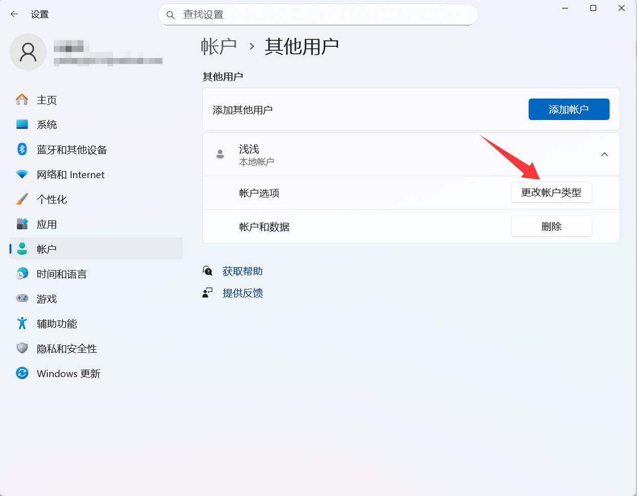 如需更改账户类型,可点击本地帐户名右侧的下拉箭头,在下拉列表中选择【更改帐户类型】。