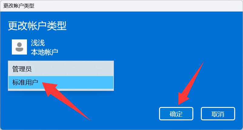 在【帐户类型】下拉列表中按需选择【管理员】(拥有系统管理权限)或【标准用户】(仅限日常使用),这里选择【标准用户】,再点击【确定】。