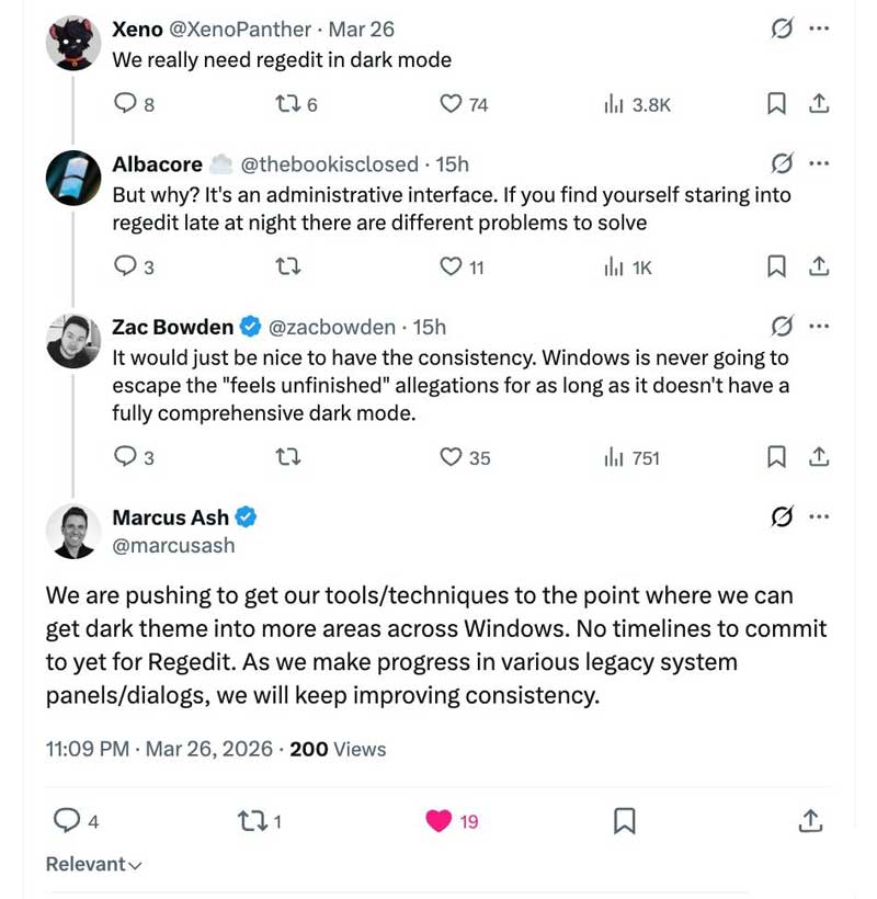 微软目前正在持续推进 Windows 11 深色模式(Dark Mode)完善工作。公司 Windows 设计与研究负责人 Marcus Ash 在社交平台发文确认,团队正致力于将深色主题扩展至更多系统组件,消除那些仍停留在旧时代的“遗留元素”,以提升整体视觉一致性。