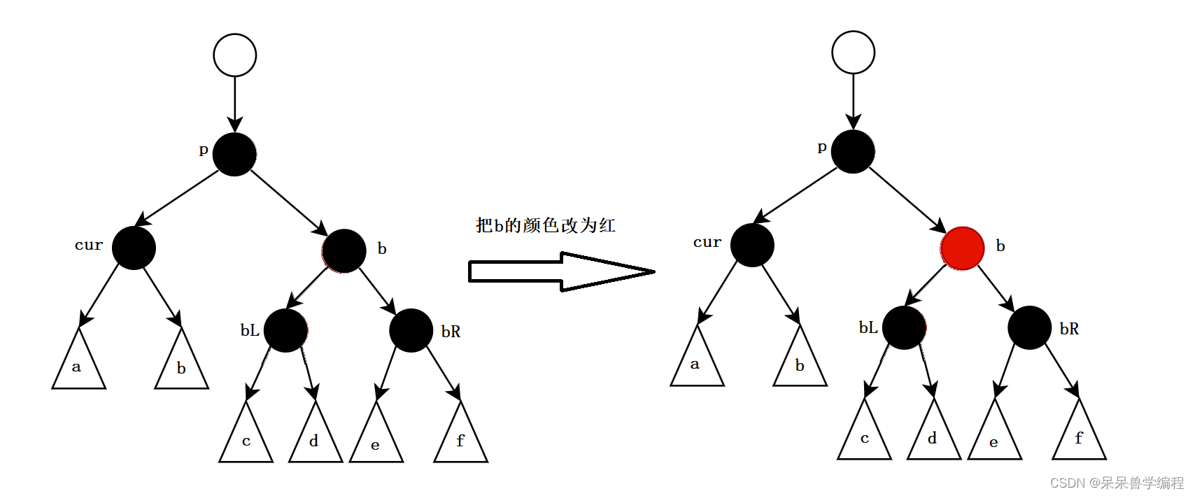 情况3: p为黑色,且b为黑色,b的两个孩子为黑 操作: 把b的颜色改为红 分析: 调整之前,p左边是缺少一个黑色节点的,调整后,两边黑色节点数相同,但是此时p的右边也少了一个黑色节点,此时p的父亲g,g的右边是比左边多一个黑色节点的,所以需要迭代向上调整,把cur变成p,继续对cur进行检索 抽象图: