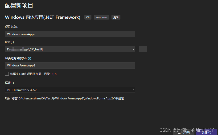 有人搜索,发现有很多选项,这个并不是冗余,每一项都有对应的功能 可以发现第一项 Windwos窗体应用,默认的框架为 .NET6.0 和 .NET7.0 可以发现第二项 Windows窗体应用(.NET Framework) 默认框架为 .NET Framework 4.x 从这里我们就可以看出了,不用选项,其实框架对应的版本都是不同 要根据自己项目选择合适的框架。如果是老项目,建议还是用 .NET4.X,如果是全新项目就没有这个要求了 1.1 新建一个 .NET4.x 的项目