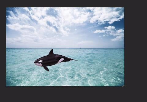 将海洋背景图片置入PS画布 将鲸鱼图片置入画布中,如果鲸鱼图片不是透明照片需要先将鲸鱼抠出,将鲸鱼图片缩小至合适大小,放置水面中 选择矩形选框工具,将鲸鱼水下部分选出(