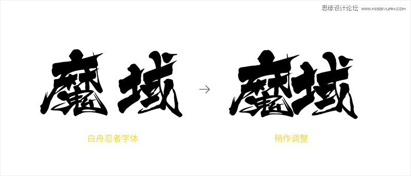 拼好以后就是这样,像“魔”字中间那一块的笔画比较紧凑,可以选用简单清晰的、飞白较少的笔触;像“域”字右半边空间充足、边缘的地方,就可以选择飞白较多、表现力强、比较夸张的笔触去打破一下。这样可以让字体笔画有繁有简、张弛有度,看起来更加和谐、有秩序感。