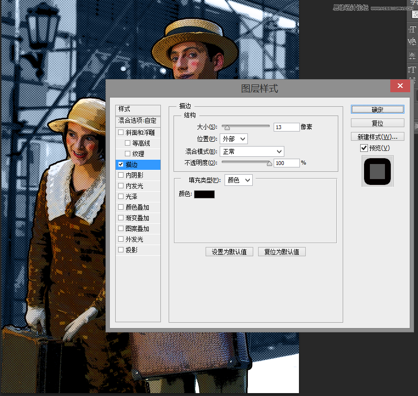 双击人物的右面调出图层样式,给组添加一个描边,大小13像素。