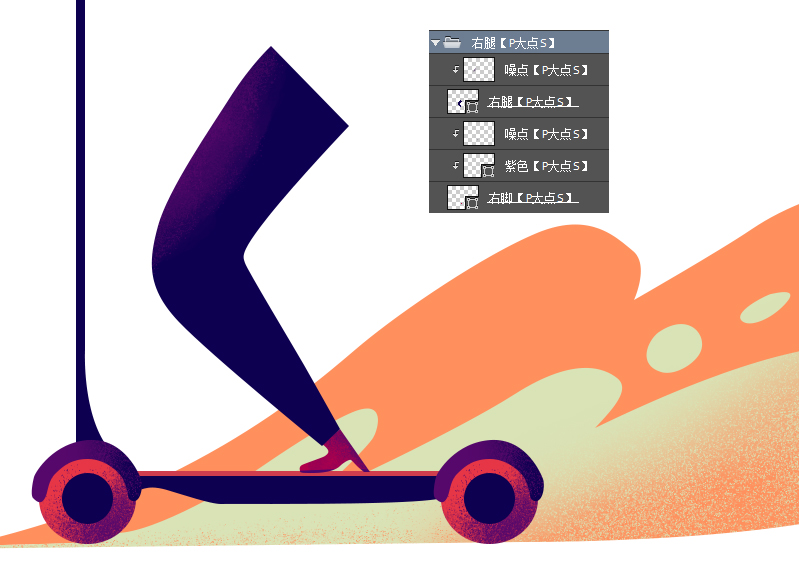 通过上面四个动态图的对比,相信大家也会认为,还是喷枪柔边低密度粒状,喷枪硬边低密度粒状这两个效果会更好一些,而我相信大家也看出来了,我们在这个示例中,用的就是喷枪硬边低密度粒状。 当然,噪点插画的噪点添加并不止这一个方法,只是今天我们是讲的用画笔预设,其实网上也有很多噪点笔刷,有时间的话,我也去帮大家找找资源。 6、接下来,我们来做滑板车,基本的形状,相信大家得心应手吧。