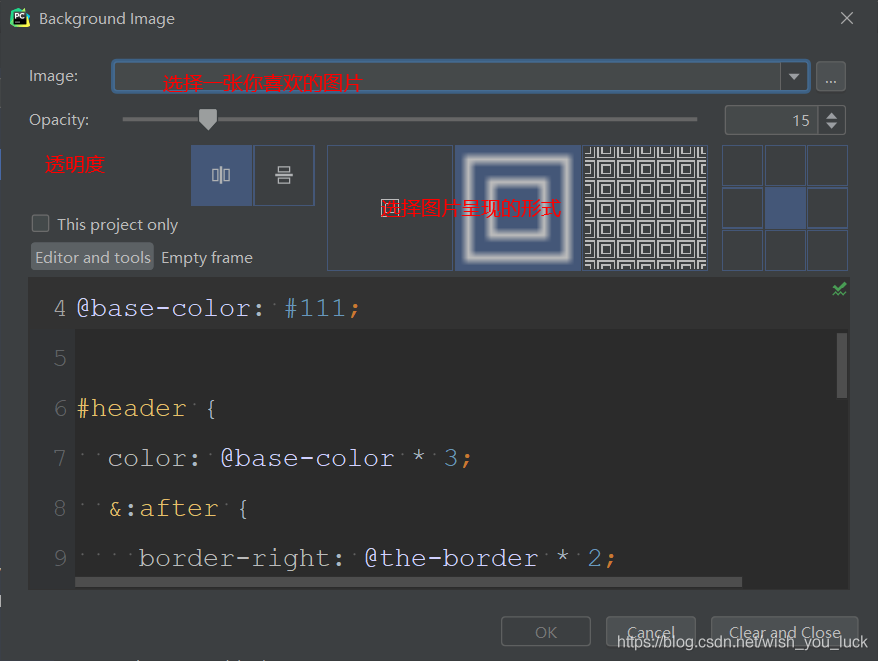 当然,官方还给出了更加人性化的设置----自定义背景图片 其中的选项见下图,大家可以多试几次,很快就能选出自己满意的背景。