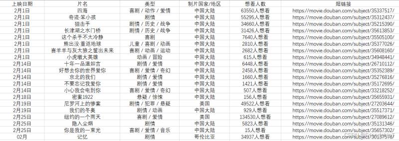 Python是一种跨平台的计算机程序设计语言。是一个高层次的结合了解释性、编译性、互动性和面向对象的脚本语言。最初被设计用于编写自动化脚本(shell),随着版本的不断更新和语言新功能的添加,越多被用于独立的、大型项目的开发。Requests是一个很实用的Python HTTP客户端库。Pandas是一个Python软件包,提供快速,灵活和可表达的数据结构,旨在使结构化(表格,多维,潜在异构)和时间序列数据的处理既简单又直观。Time是python标准库,无需额外下载,主要用于处理时间问题。Lxml是XML和HTML的解析器,其主要功能是解析和提取XML和HTML中的数据;lxml和正则一样,也是用C语言实现的,是一款高性能的python HTML、XML解析器,也可以利用XPath语法,来定位特定的元素及节点信息。 实验目标:Python爬取2022春节档电影信息