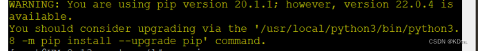出现下面的情况:他叫你升级pip,所以输入它提示的信息如下,再输上面命令 /usr/local/python3/bin/python3.8 -m pip install --upgrade pip 2、安装uwsgi错误2:提示root环境下,下载可能会有冲突