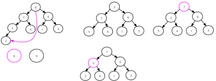 堆调整完毕,开始把新的堆顶 8 和最后一个记录 2 进行交换,然后将堆顶下沉,调整为堆,如下图所示: