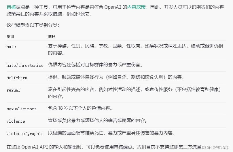 其他API的使用方法基本一致,利用api调用进行测试即可,但也请不要进行各种无边界的测试。 以下是openai的审核规范,如果被检测到将不会返回结果。
