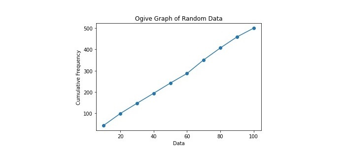 在这个例子中,我们首先使用NumPy生成一个包含500个0到100之间的随机数的数据集。然后使用NumPy计算出数据的累积频率,每个频率的区间宽度为10。最后,使用Matplotlib绘制累积频率与每个区间的上限之间的关系,生成ogive图。这个例子演示了如何使用Python和随机生成的数据创建ogive图。 输出