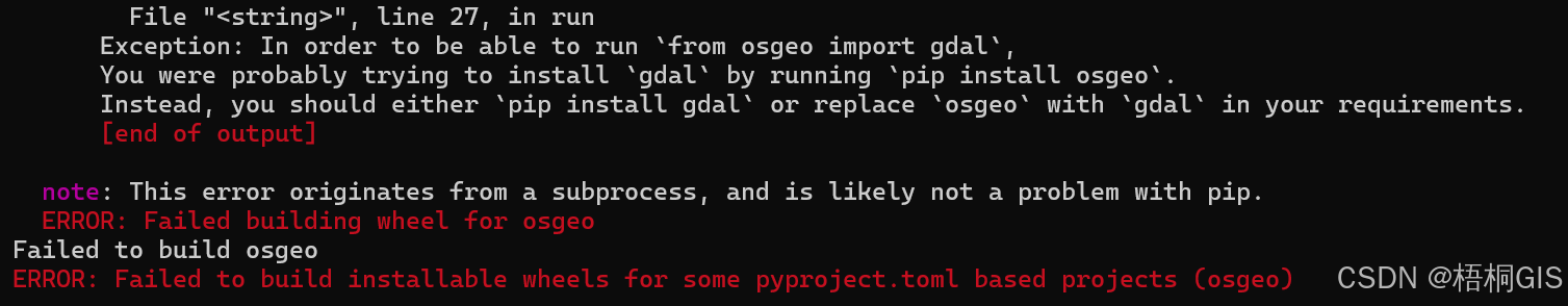 Osgeo(Open Source Geospatial Foundation)是一个支持开源地理空间数据处理的基金会,我们可以在python中使用“osgeo”库来访问其提供的高效地理空间数据。例如,我们使用该模块提供的GDAL处理栅格数据,使用OGR处理矢量数据,使用OSR进行坐标系统参考和投影转换处理等。它的环境配置极其依赖于GDAL库(Geospatial Data Abstraction Library),GDAL也是一个开源库,它的功能与osgeo库绑死了,有助于Python更好地处理地理空间数据。 小编想使用osgeo库进行nc文件转tif文件的处理,在PyCharm安装osgeo库的时候,显示:ERROR: Failed to build installable wheels for some pyproject.toml based projects (osgeo)随后,小编使用“Windows+R”进入cmd命令,安装,仍然报同样的错误。