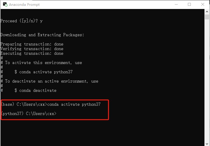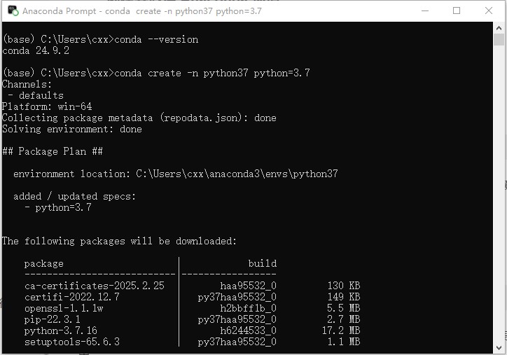 输入上述命令后,系统会提示确认是否安装相关依赖包,输入 “y” 并回车,开始创建环境。创建过程可能需要一些时间,等待安装完成。 (二)激活环境环境创建完成后,输入以下命令来激活 “python37” 环境: