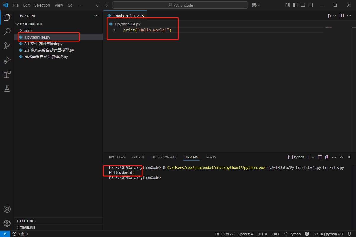 按下F5键或点击菜单栏中的 “运行” -> “启动调试”,在弹出的调试配置选择中,选择 “Python 文件”。 如果一切配置正确,会在 VSCode 的终端中看到输出 “Hello, World!”,这表明 Python 运行环境已经成功配置。 通过以上步骤,已经成功地从零开始搭建了使用 VSCode 和 Anaconda 的 Python 运行环境。 |