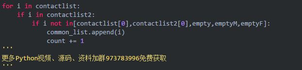 拿到的好友信息是什么样的呢?其实特别有用的并不多,你的微信号和联系方式是拿不到的。 ![]() 而这里的UserName,同一个你在不同的微信号中UserName并不相同。所以,在并没有一个可以特定区分好友的情况下,我们选择获取多组信息来组合拼凑成一个整体,这里我选择了以下数据组成一个字典dict: ![]() 通过以上一个字典八组数据来代表每一位独立好友信息。接下来在要比较的两组好友信息列表中,进行查重,这里我采用了最笨的遍历方法: ![]()