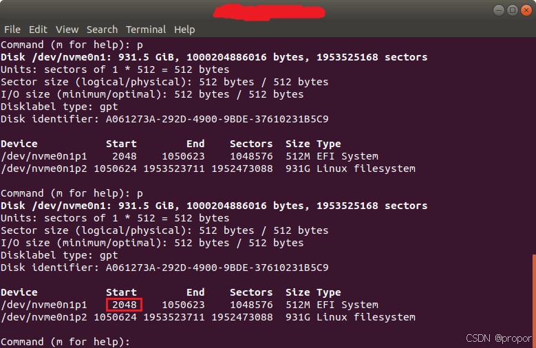 这里就不详述了。 4.复制引导分区在磁盘的最前端分配了一段空间,用来存储引导加载程序和其他与引导相关的文件。 这段空间很重要,关系着系统能否正常启动。不同的系统这段空间大小也是不一样的,比如台式机这段空间通常为1MB,如下图,EFI System起始为2048扇区(1个扇区为512字节)说明前1MB(2048*521B)被保留为引导分区。而有些嵌入式系统这段空间可能大于1MB,如树梅派系统这段空间为4MB。